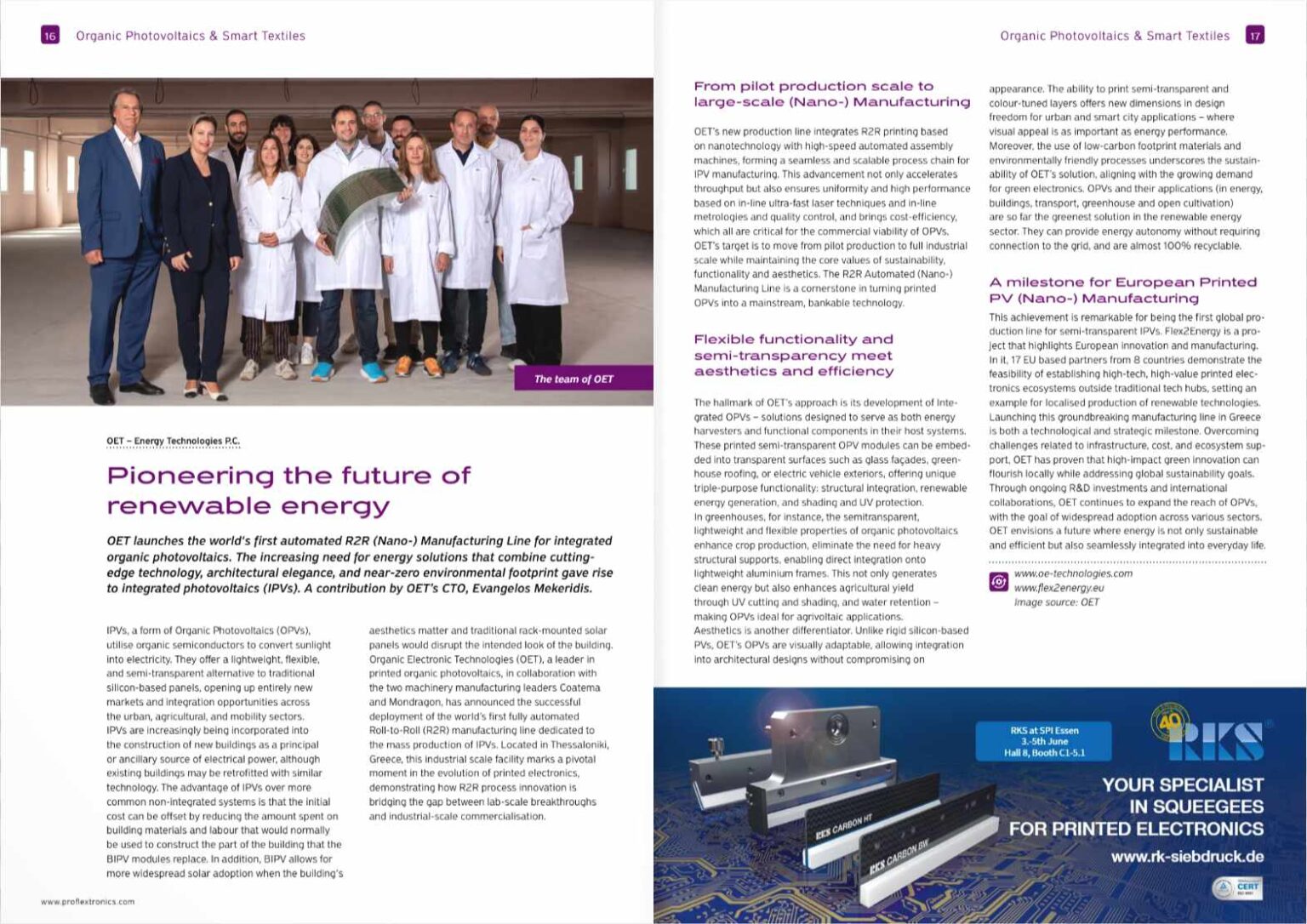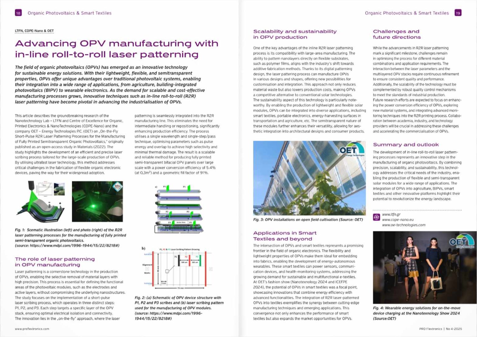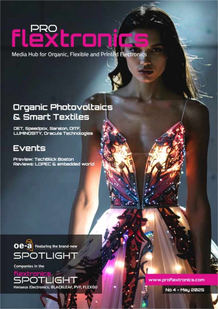 In the May 2025 issue of PRO Flextronics, two articles highlight OET’s advancements in Organic Photovoltaics (OPVs):